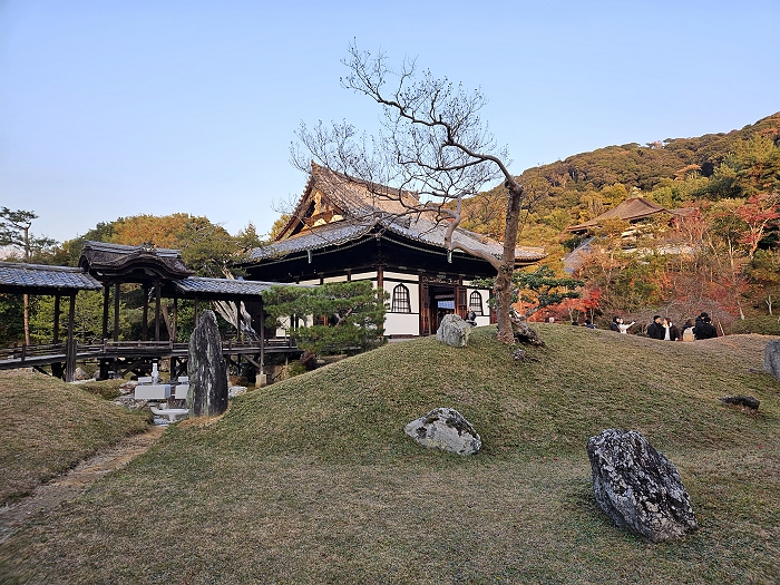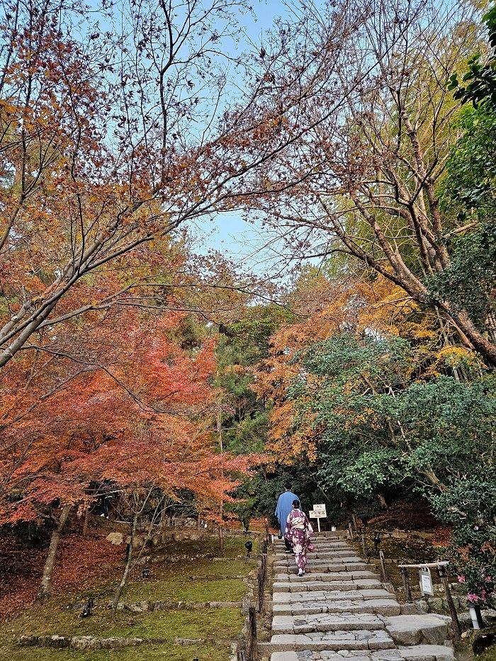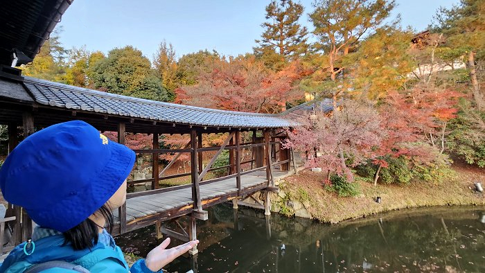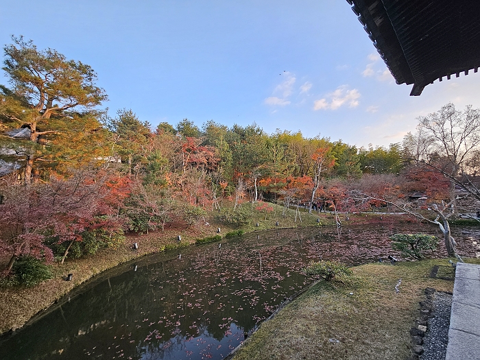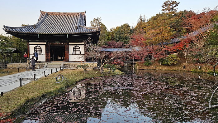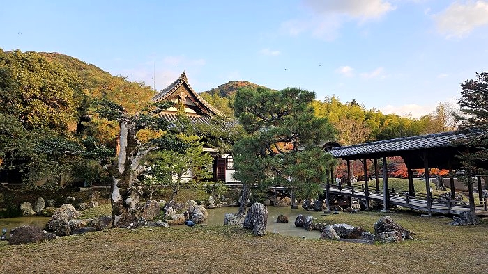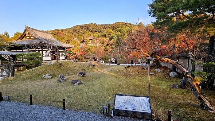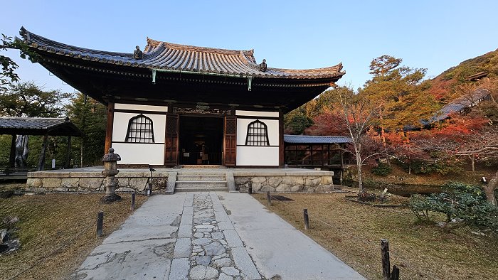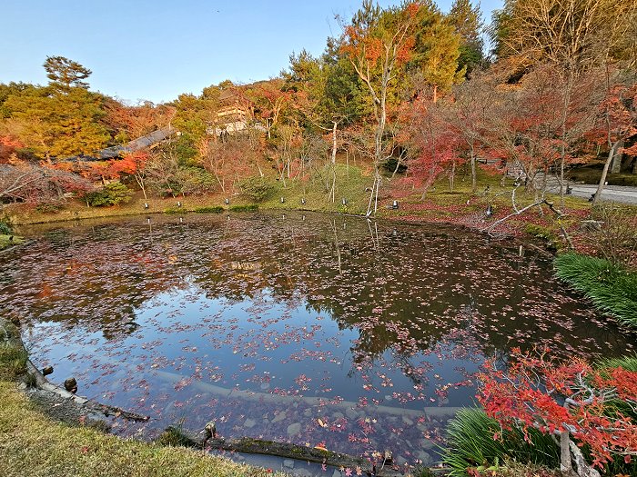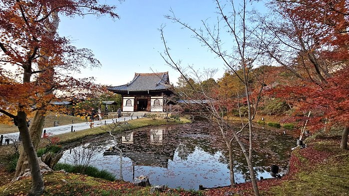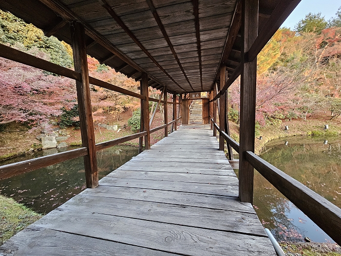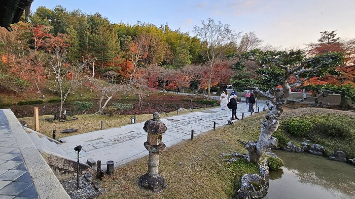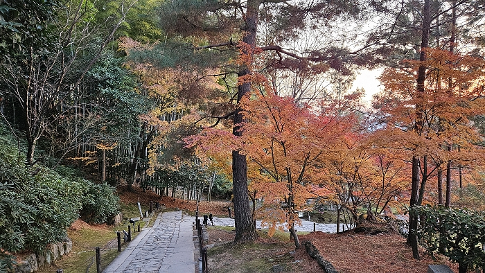 自開山堂眺望參道,紅葉與竹林作背景,左為臥龍池右是偃月池。