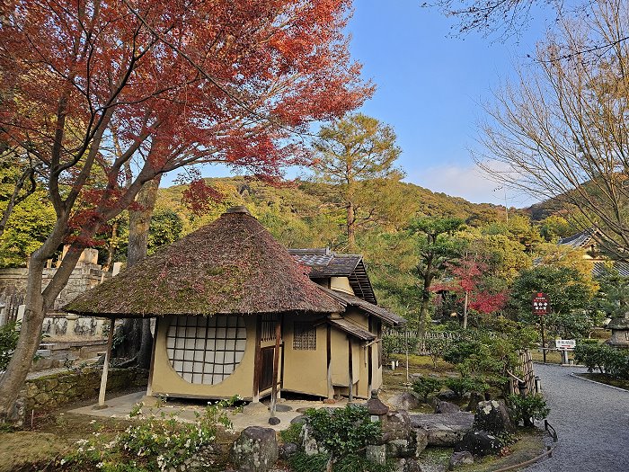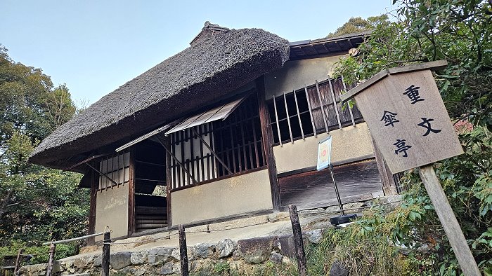 「傘亭」與旁邊的「時雨亭」都是著名茶道大師千利休設計的經典之作,皆在慶長年間從伏見城移築於此,與當中連結兩棟茶室的「土間廊下」共同被列為重要文化財。