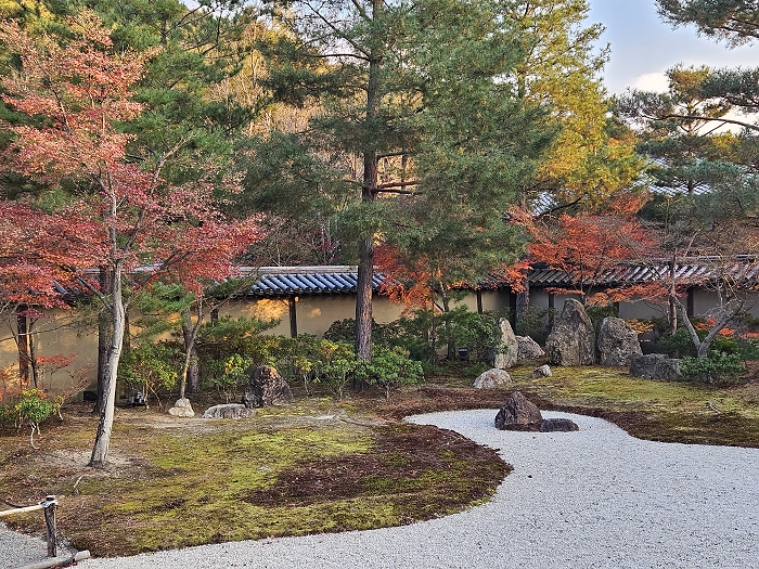 高台寺庭園一隅,紅葉青苔伴襯赤松挺立。
