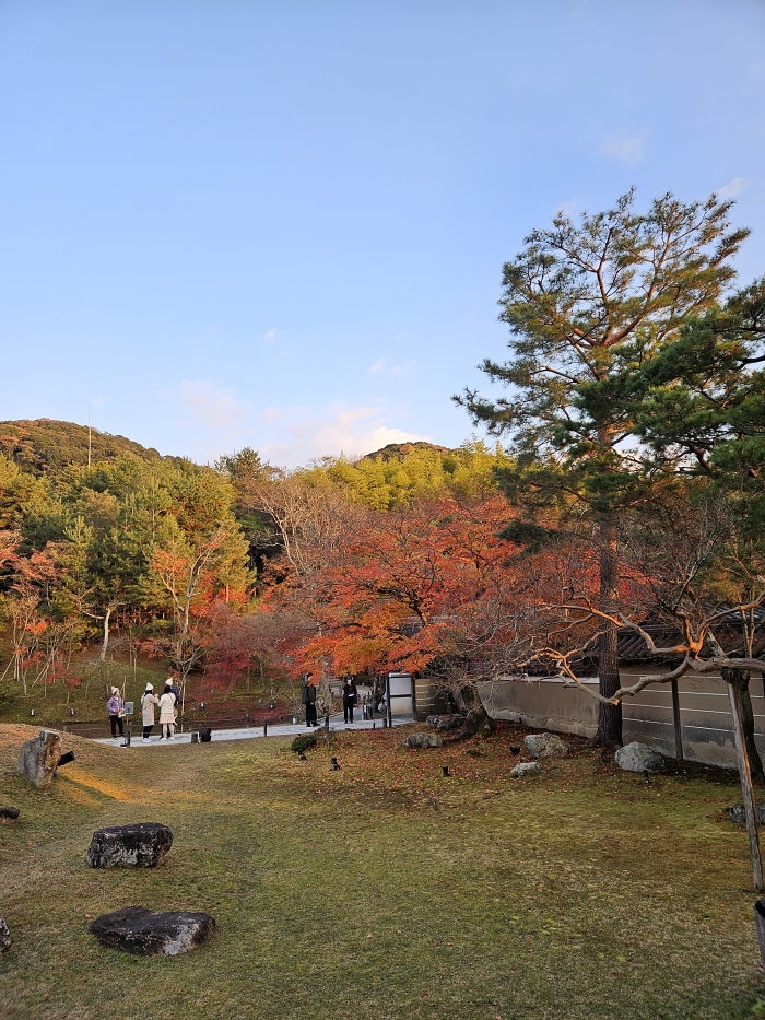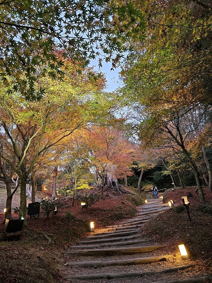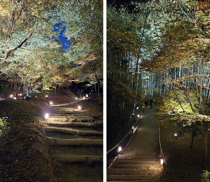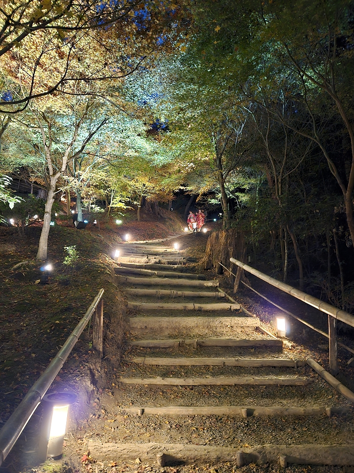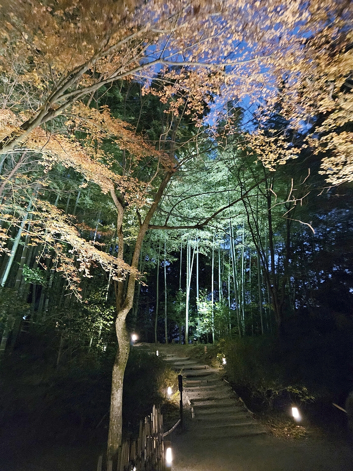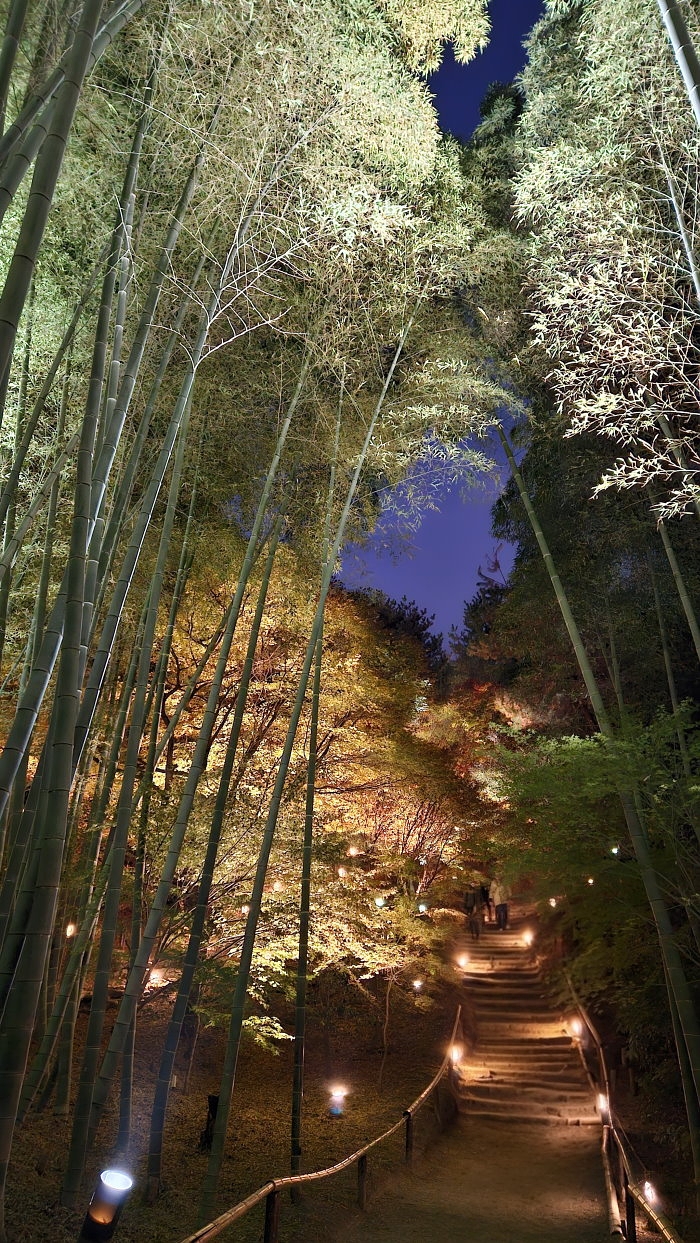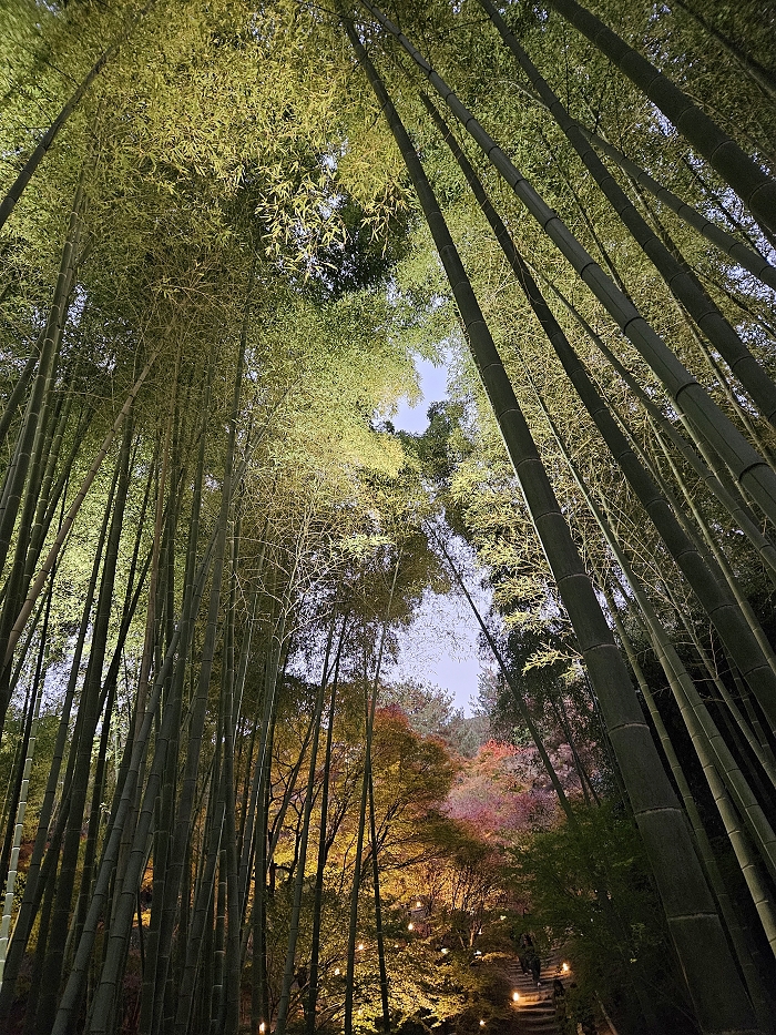 楓林紅葉與竹林青翠交織出高台寺山林夜色之美。