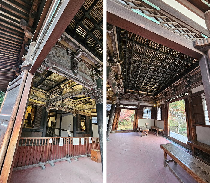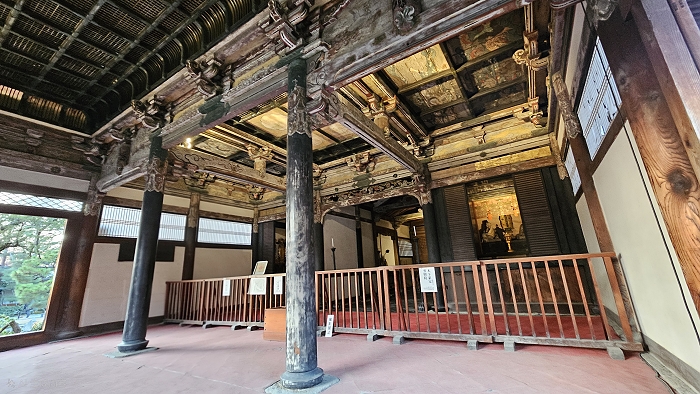 開山堂內的木架構材質十分斑剝古舊,很有歲月滄桑感,原來天花板這些木料據說是使用了秀吉曾乘坐的御座船,以及寧寧曾使用的御所車構件。堂中央供奉著中興開山住持三江紹益禪師,左側供奉寺廟建造者堀間物直政,右側是寧寧的親族。