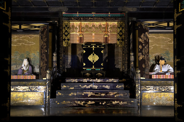 靈屋內部的「須彌壇」與佛龕(圖引高台寺官網)。以華麗的「高台寺蒔繪」裝飾,透過在黑漆上撒金粉來呈現華麗的花紋,被視為桃山時代漆工藝的代表作品。壇上安奉寧寧與秀吉的木像,而寧寧的遺骸據稱埋葬於自身雕像下方約2公尺處。