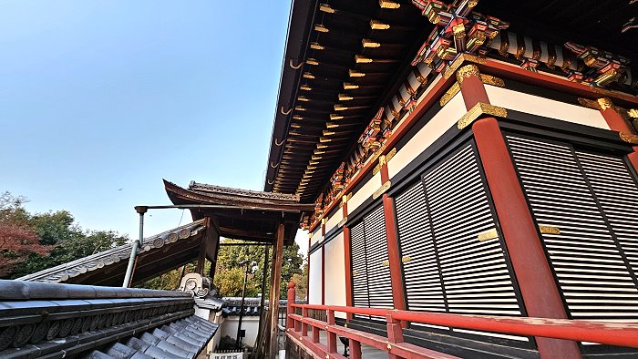 靈屋的側廊,可以看見一道傾斜的屋頂,是為連接開山堂的「臥龍廊」。