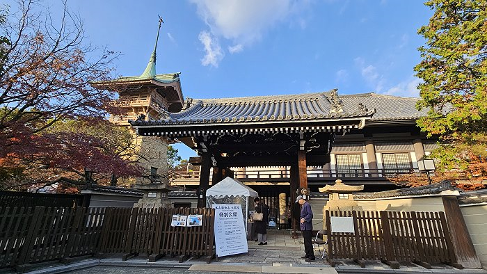 高台寺拝観入口,右後方建築為「庫裏」,内部為寺務所。當時因旁邊進行客殿工程,外面有牆板圍起來,無法拍全。庫裏的左側有拝観受付處。
