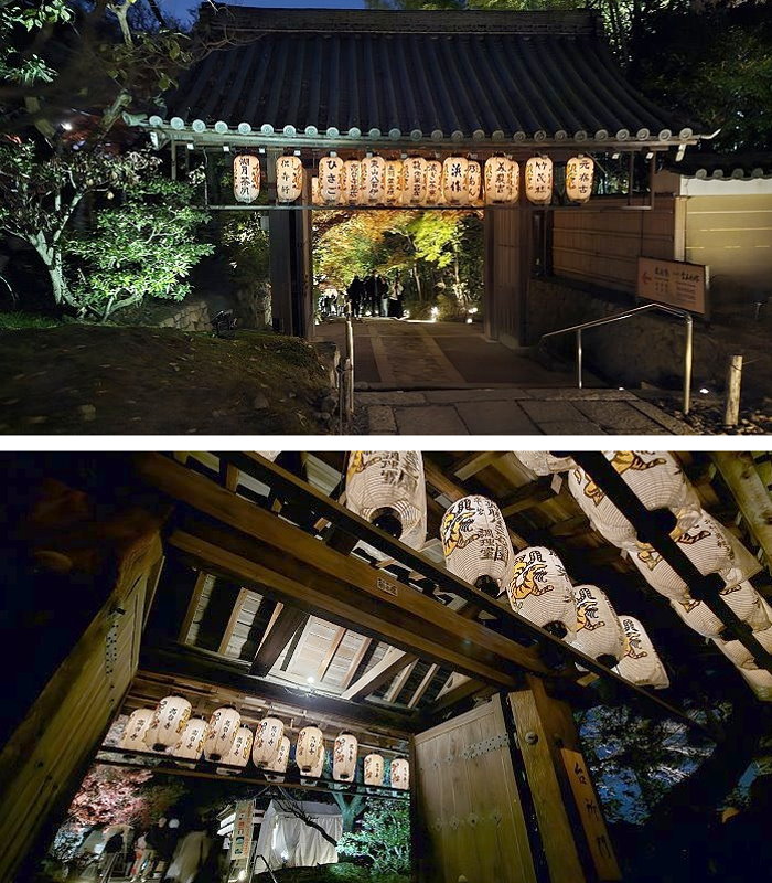 高台寺庭園中門上紅葉在夜色中美不勝收。