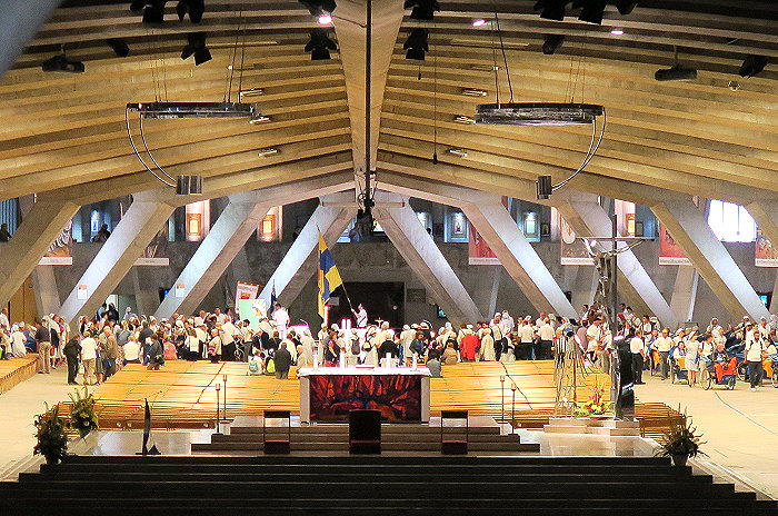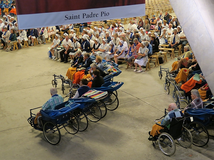 聖庇護十世聖殿入內是緩坡道的設計,因應關照年長或行動不便的朝聖教徒。