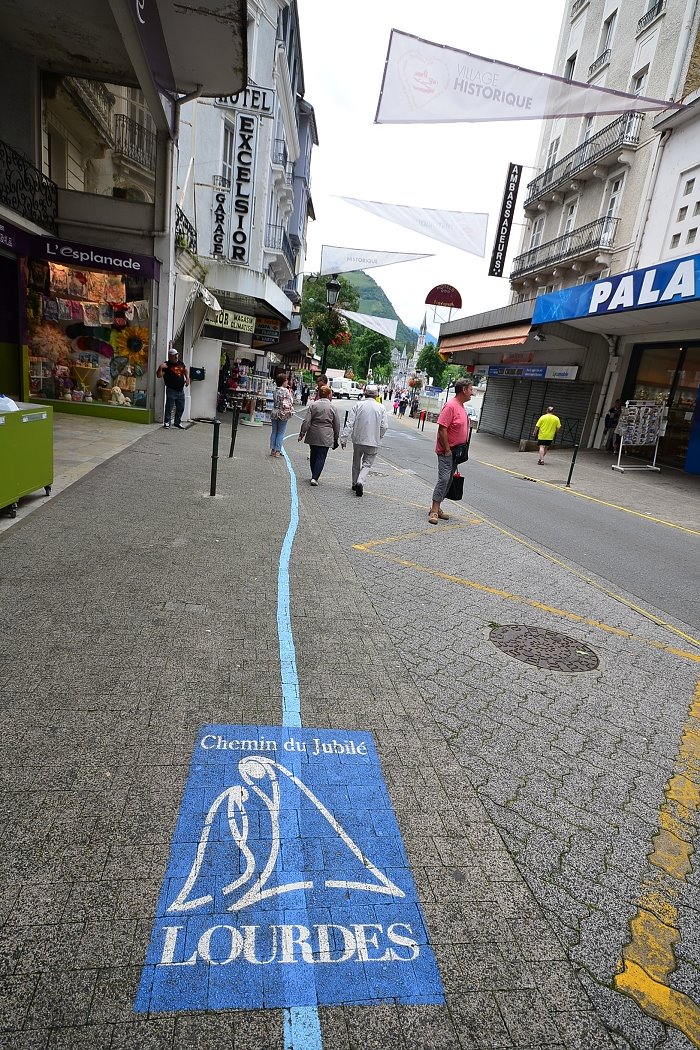 Lourdes鎮上路面畫有通往聖母朝聖地的路線,沿著走就對了。