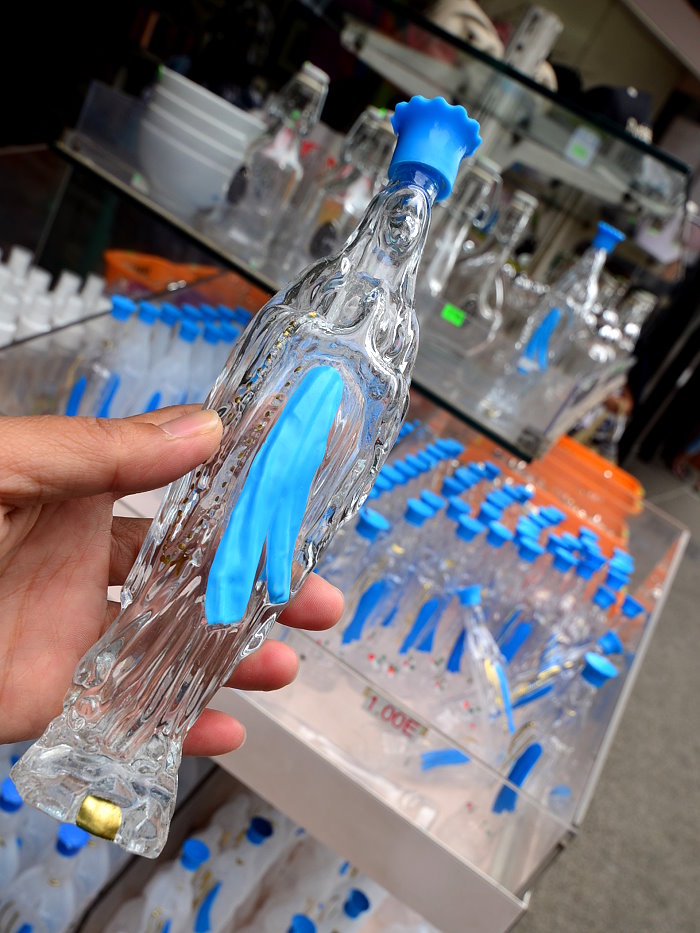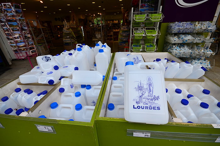 聖母向伯爾納黛·蘇比魯(Bernadette Soubirous)啟示附近的岩洞有治療疾病的泉水,至今朝聖者可以免費在岩洞附近的噴泉水龍頭直接飲用或取用泉水,因此Lourdes鎮上很多商店都賣有裝聖水的器具。