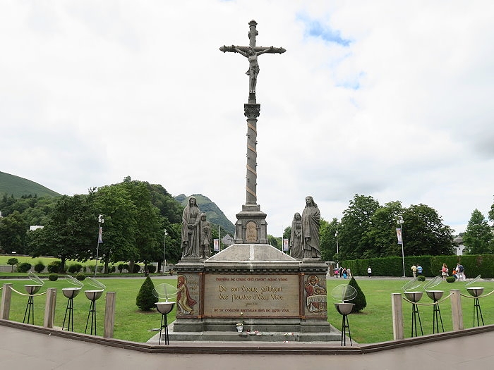 聖殿的庭院,以一條中心軸線佈局從聖米歇爾門通往聖殿前的「玫瑰經廣場(lesplanade du Rosaire)」,配置左右雙道路徑;聖殿左後方為埃斯佩呂格山(la colline des Espélugues)。