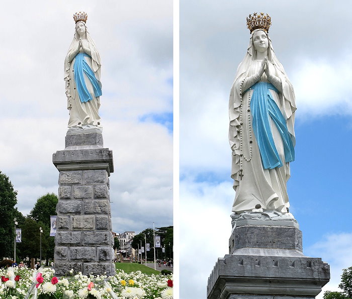 玫瑰經廣場面向聖殿有尊2.5 公尺高的盧爾德聖母,其經典造型源自1858年聖女伯爾納黛的描述,形象為一位年輕貌美的女子,身穿白衣、腰繫藍帶、腳踏金玫瑰,雙手合十,手腕掛有一串念珠。