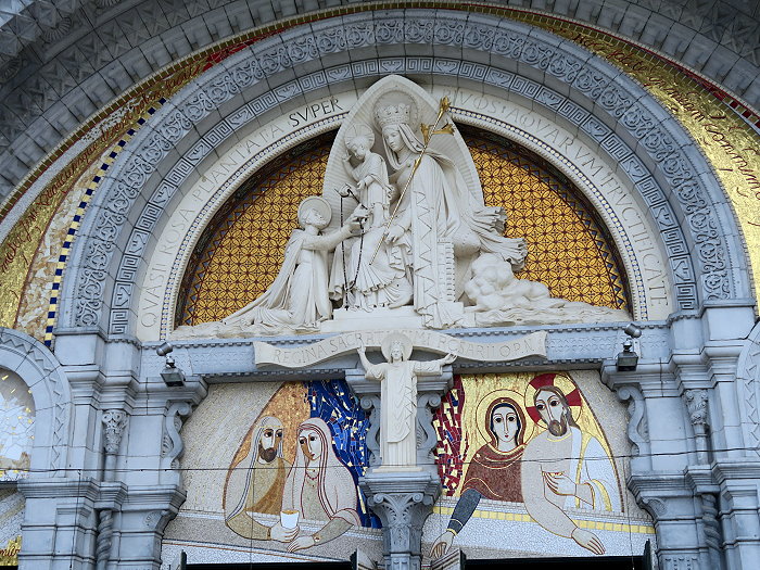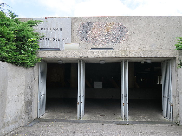 聖庇護十世聖殿(Basilique Saint Pie X)入口。聖庇護十世聖殿建在聖殿廣場下方,因完全建置於地底下又名「地下聖殿」,於1956年動工,正好在1958年聖母顯靈百周年時竣工並祝聖。