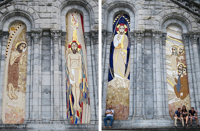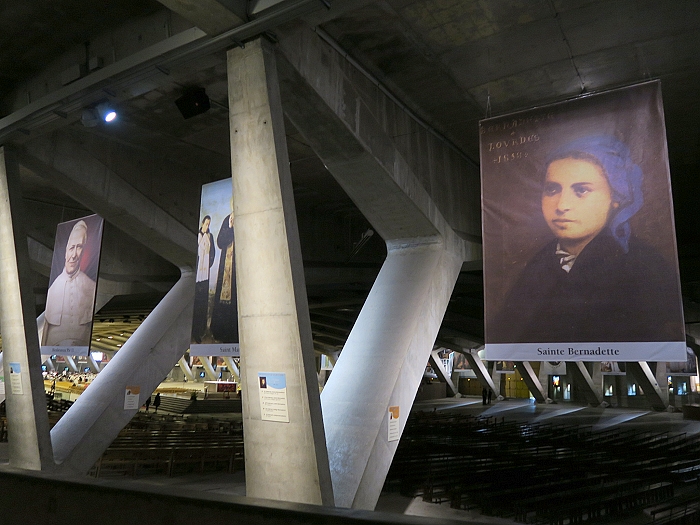坡道的兩側懸掛有眾多聖人之影像,聖女伯爾納德 (Saint Bernadette)為1858年於馬薩比耶勒岩洞見識聖母瑪利亞18次顯聖的少女。