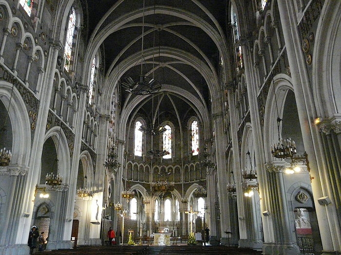 中殿(圖引維基百科,作者Par Père Igor)。聖母無染原罪聖殿內部建築設計融合了中世紀的藝術風格,充滿著壁畫、雕像和彩色玻璃窗,裝飾華麗。