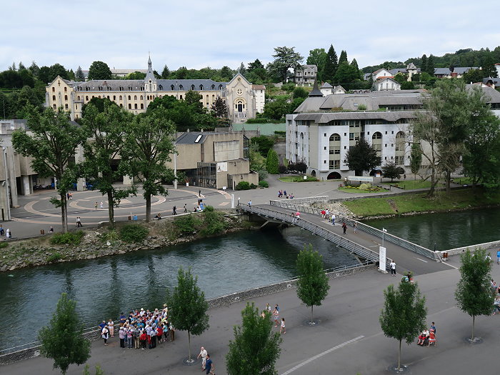 波河(Gave de Pau)右岸的現代建築群:聖伯爾納德教堂(Église Sainte-Bernadette de Lourdes)與聖母接待中心(Accueil Notre-Dame);後方是加爾默羅修道院(Monastère du Carmel de Lourdes)。