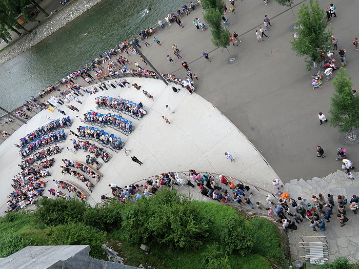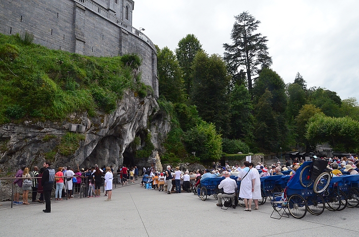 俯瞰波河(Gave de Pau)左岸,馬薩比耶勒岩洞前的廣場上大排長龍,都是要進洞穴內朝聖的人潮。