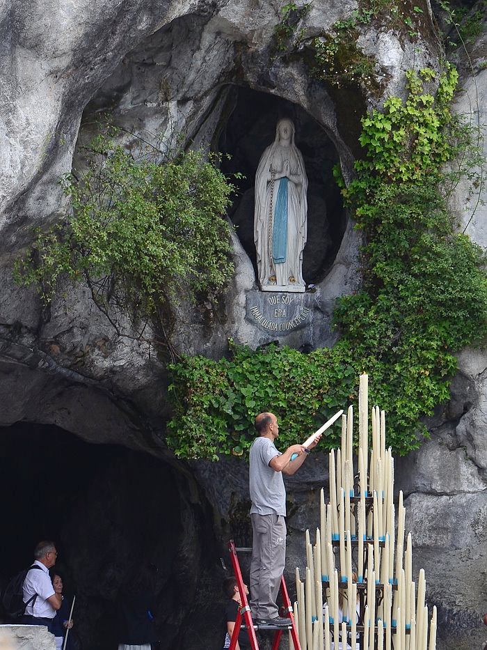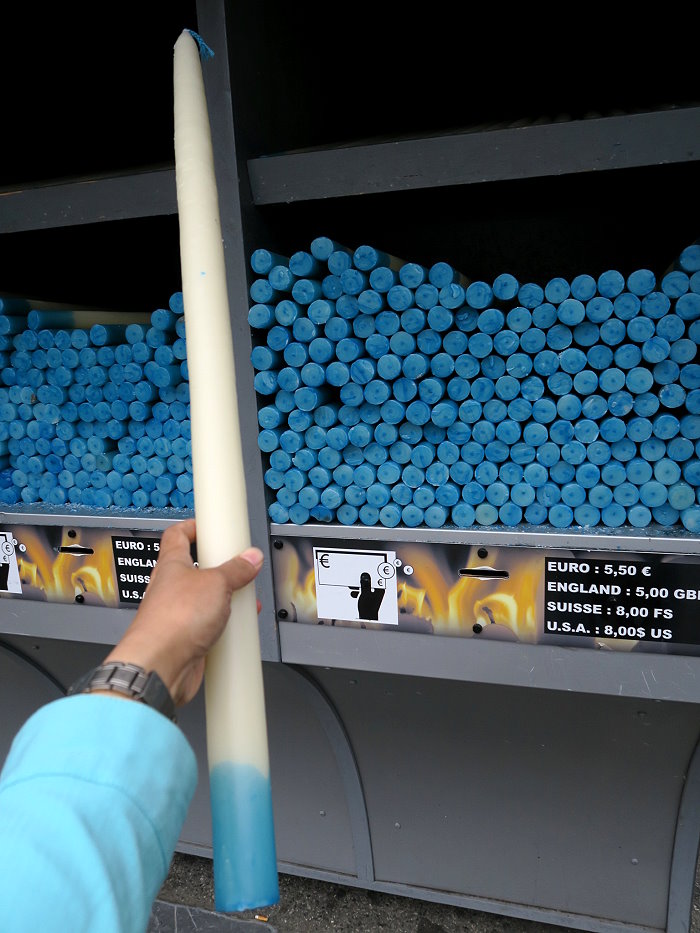 朝聖者會帶來祈福的蠟燭在岩洞前點燃,再置放燭台上。