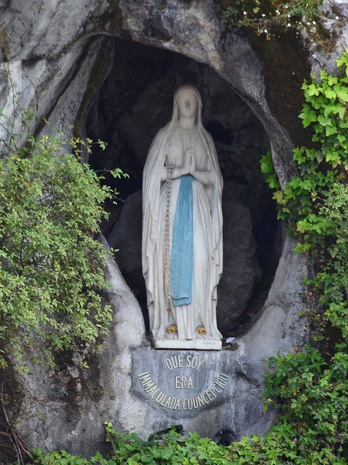 岩洞中安置由法國雕塑家約瑟夫-休斯·法比什(Joseph-Hugues Fabisch)以卡拉拉大理石雕刻高2公尺聖母瑪利亞雕像。下方文字「Que soy era Immaculada Councepciou」(我是始胎無染原罪者)──是聖母瑪利亞顯現給少女伯爾納德時所說的方言(奧克語/加斯科涅語)。