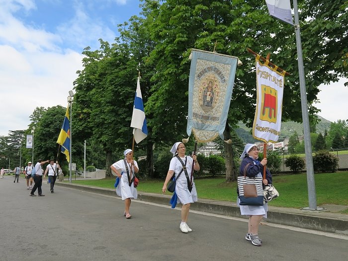「L’Hospitalité d’Auvergne 」醫護人員的舉旗──這是由男女信徒組成的志工團體,在盧爾德朝聖之旅期間每位志工服務項目包括:指引朝聖者的旅程與陪伴患病的朝聖者。