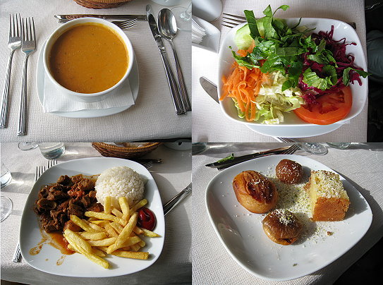 我們在加拉達塔頂餐廳的用餐內容:豆子湯、生菜沙拉、紅燒牛肉、甜點。甜點看起來挺吸引人,入口,僅適合屬螞蟻的饕客~~當真是甜死人不償命!