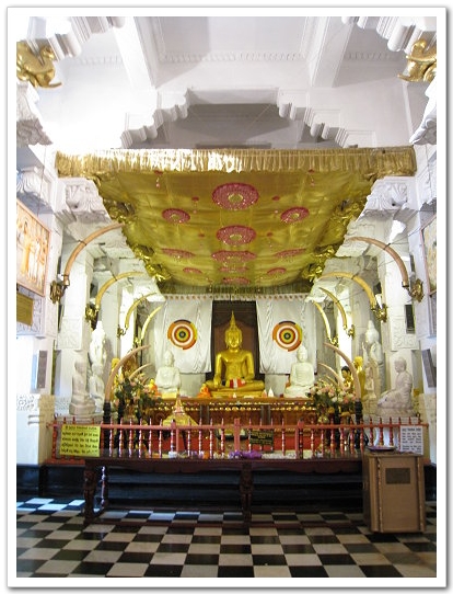 新殿的主壇有金色的華蓋,左右佐以成列的佛牙,莊嚴肅穆。