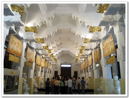 新殿陳設更見金碧輝煌,除有象牙、雲石等裝潢,更有多幅描繪佛教事的油畫。
