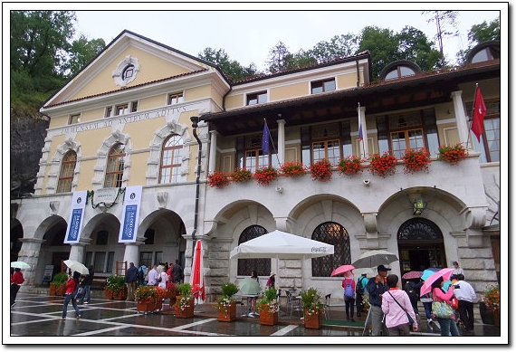 建築的左方(懸藍白長條旗幟處)是通往波斯多茵娜溶洞正式入口,右方有紅花的部分是餐廳。