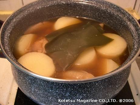 4. 先將蘿蔔同昆布高湯一起燉煮,等蘿蔔熟後再加入雞肉。