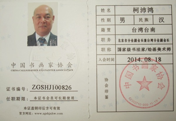 南菁藝術學院柯沛鴻院長獲聘中國書畫家協會北京分會副會長兼台灣分會副會長並認證國家級書法家及繪畫美術師