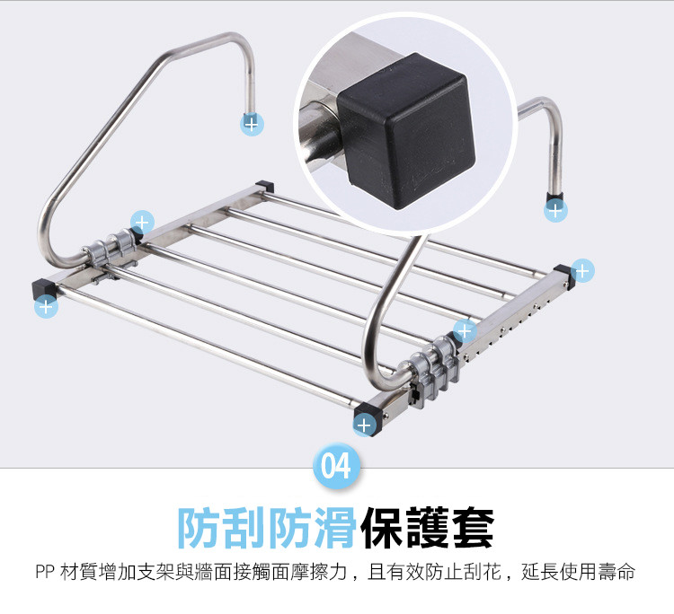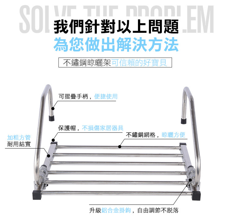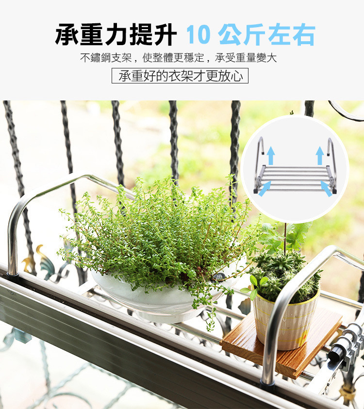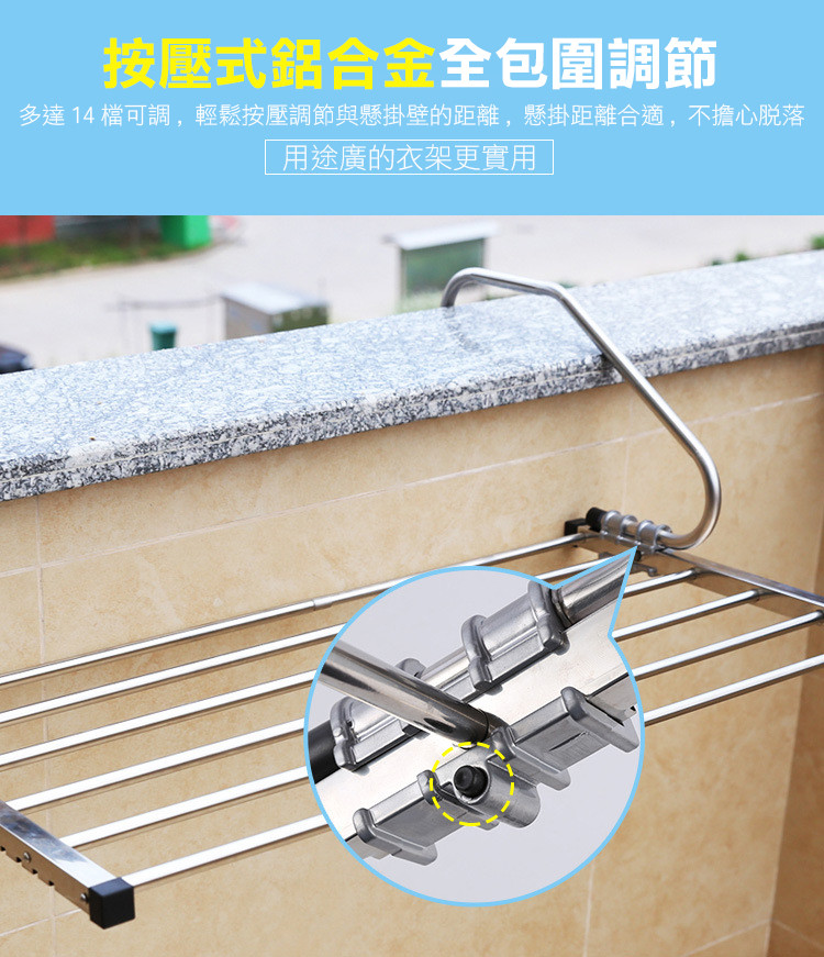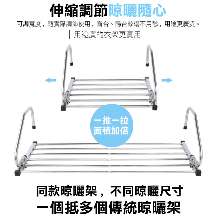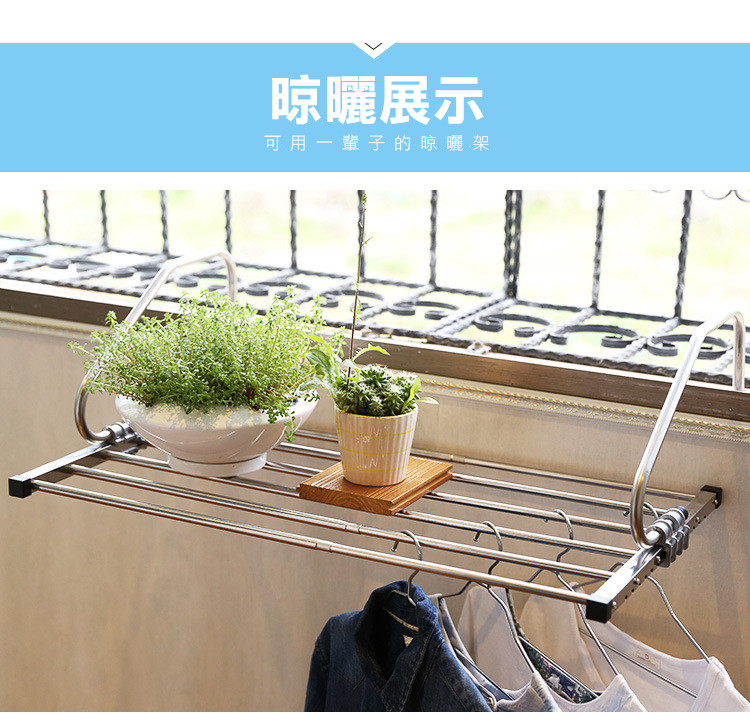 精選不銹鋼,表面精拋氧化,不生銹,不變形,抗老化,承重力強,堅固耐用,可伸縮折疊調節寬度,隨您的需求調節使用,陽臺窗臺室外晾曬更方便,用途更廣泛~~