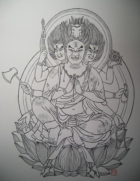 在多數人印象中,觀音始終是慈悲與和藹面容的形象.第一次看見憤怒尊,總是有難以接受與震撼的感官衝擊.在稿本處理中,目光總是離不開那雙震攝人心的雙眼.似乎一切惡念與慾求都在牠眼底自動降伏,想著自己筆下所繪出的雙眼,不知是否仍有如此強大的力量.打稿都是習慣由上而下,正式白描則反之.是希望將最重要的面形與雙瞳這成敗的關鍵留在最後處理.一來運筆久了可以掌握線條順暢,二來借由最終"開面"前檢視全圖的完成度與其中遇到的缺失,休息片刻,讓手與心短暫平靜後一股作氣去完成最後階段.當然...若是最後過程疏失造成失敗,那前面所完成的部分就不算完成了.人生,許多事,不也是如此嗎?(次回 如意輪觀音)