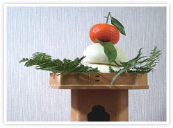 鏡餅---在古代時,作為祭典用的鏡子相傳都是用圓形鏡子,傳說圓形更能夠加強它的靈力,因此很多神社以圓鏡為神明的形體。現在在日本的神宮以及神社所使用的鏡子也都是圓形、而且鏡子也是被祭拜的一種神器。 「餅」在日文裏是麻薯的意思。日本人過年也吃年糕,他們叫做鏡餅,兩塊或三塊像鏡子般扁平狀的年糕疊在一起,代表好事重疊,有時在上面放橘子,是祈求世代興盛繁榮的吉祥物;有時也在橘子上方裝飾一把扇子,祈求能招引幸福,永遠興榮。 而之所以做成一大一小的兩個圓形是象徵年與年之間圓滿重疊的意思。大的代表太陽,小的代表月亮,這是象徵福德重疊的意思。在日本迎新年的時候鏡餅已經變成一種裝飾的習俗了、日本紀元前的垂仁天皇時代、大國主命神曾經對大物主神的女兒大田田根子說「元日(也就是正月正日)、用紅白的餅祭拜荒魂大神會得到幸福,而且會招來緣分」。根據這說法這傳說一直沿用至今,而鏡餅漸漸變成祭祀的供品。