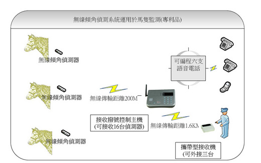 無線傾角感測網路是一種即時、精確、高效能的狀態監測解決方案,本方案是配合馬隻生產或生病的時候使用、當馬生產或生病的時候、此系統無論主人或保育人員處在何處、都可以馬上得到通知、是一種保護名駒的最好設備。