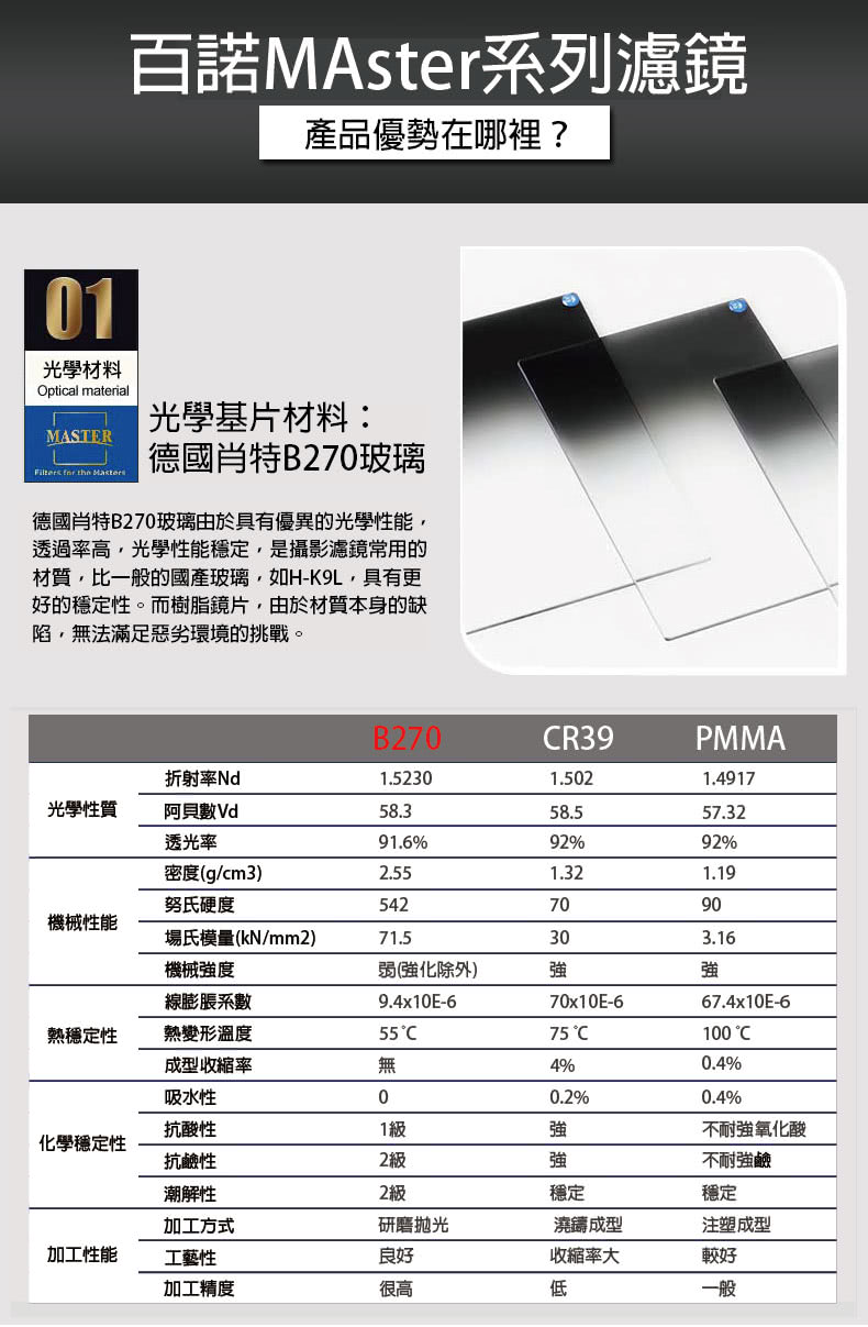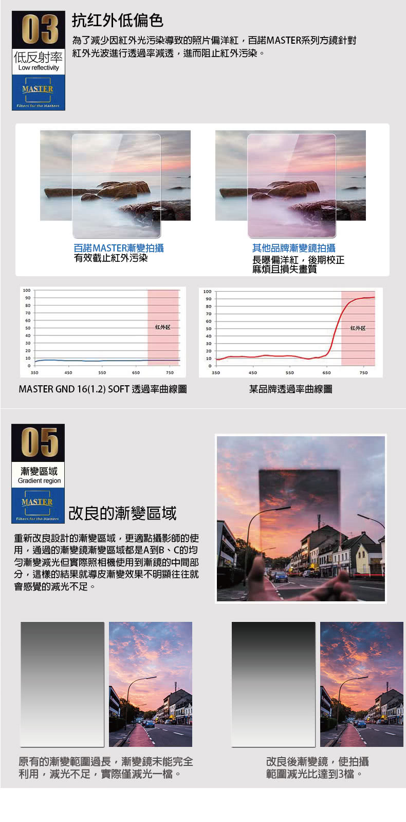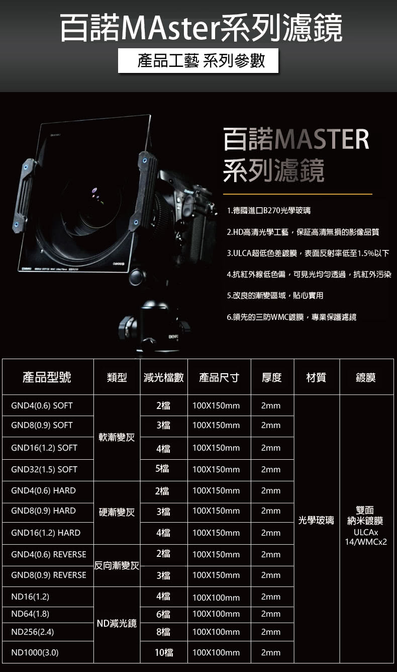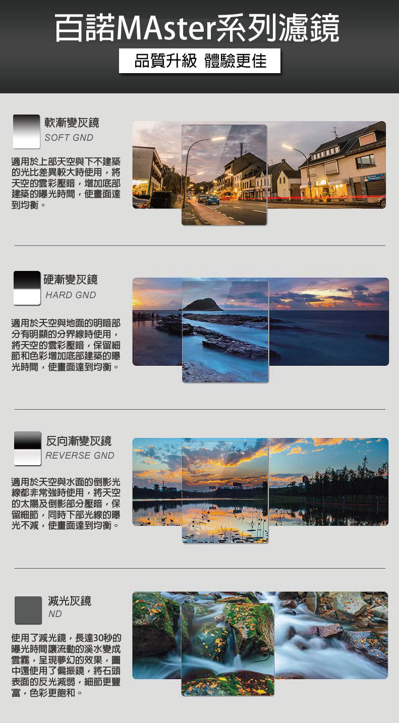 【BENRO百諾】方形濾鏡系列 MASTER SD GND SOFT 0.9-1.2-1.5 軟式150X100mm(勝興公司貨)詳細說明介紹: