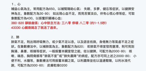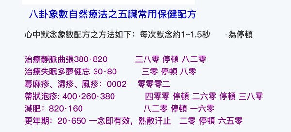 注意事項:若默念上述數字時,出現心慌、頭痛或出虛汗等症狀之一,則馬上停止默念即可。用藥原理:秉持「君臣佐使,辯證施治」之用藥原則,結合《中醫藏象學說》、《陰陽五行學說》和《周易八卦理論》配製而成:7——八卦數為艮,為土,為陽土,為胃。後加一個零,為奇數零,目的是振奮胃陽,增加胃蠕動;4——八卦數為震,為木,為陰木,為肝,肝有疏瀉、條達之功能。後加一個奇數零,強化肝之功能,達到「變則通」的效果,使胃健康有序的工作起來。