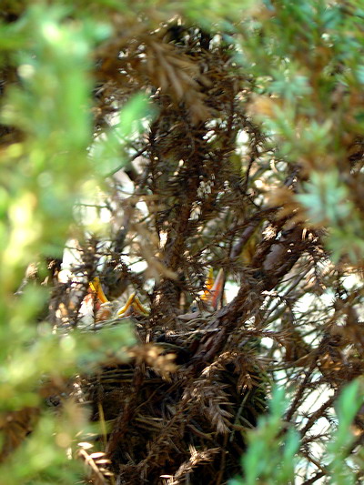 三口與我得知這消息,忍不住在樹前研究實質生態,果真看見三隻小鳥伸頸待哺,眼睛緊閉,鳥嘴張得開開的,大概是知道有「人」偷窺,索興動也不動地裝死。