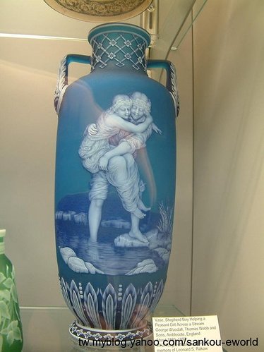圖一:在藍底玻璃上浮雕出來的美麗圖案,一位少年正協助少女過河。同樣風格的作品還有幾件,大多是以神話故事為主題。