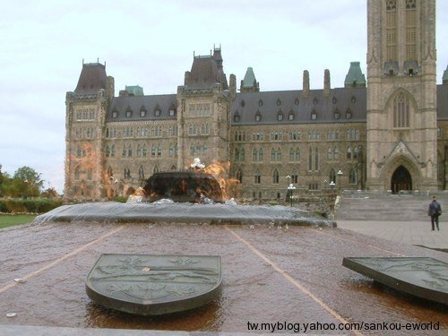 圖二: 國會大廈前面的水火同源噴水池,前方圍繞著十二省的省徽