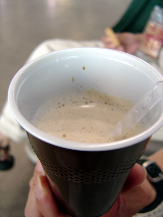 離預訂時間尚早,我與三口Check in之後便在機場隨意晃著,口渴了便在自動販賣機旁,買了一杯二十元人民幣的咖啡,咖啡機自動地落下一個紙杯,窸窸窣窣便倒完一杯Latte,取出一瞧,竟然少得可憐,只有半杯。看來機場什麼都貴,包括咖啡在內。