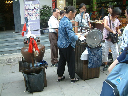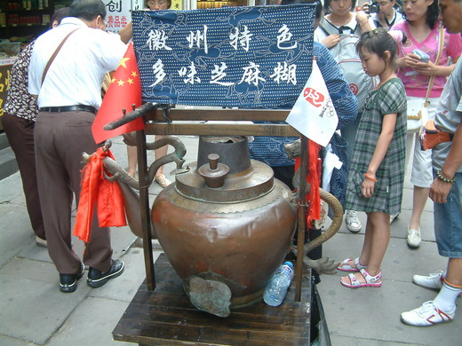 黃山隸屬安徽省,屯溪老街上的商店有賣徽墨酥、毛峰茶、太平猴魁等名產,許多來往的旅客皆來此買些土產帶回家鄉,我們也不例外。除了買到全中國頂尖的徽墨送給家人外,在這古色古香的老街上,一位站在扁擔前正在販賣芝麻糊的大嬸吸引了我的視線。