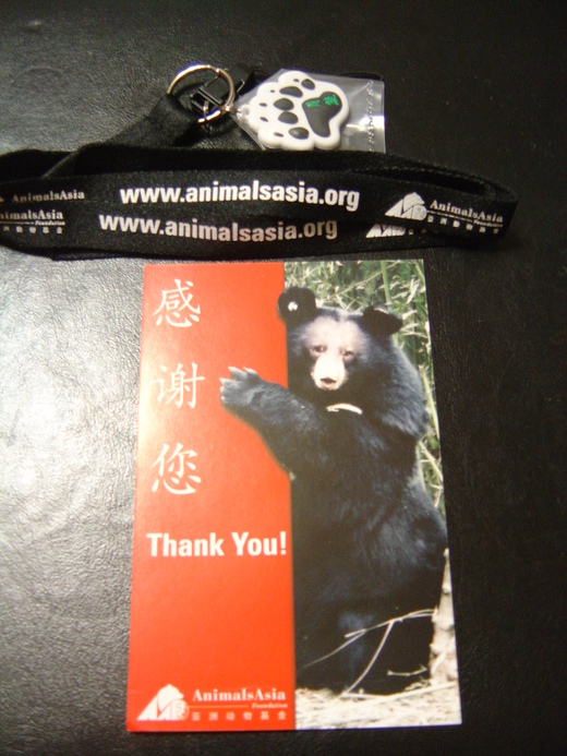 一個月後,我在台灣的家中收到了來自中國大陸的郵件,裡面附了拯救黑熊的貼紙、手機掛環、光碟介紹片、明信片及一封感謝信。其中最讓我感動的是來自那張紅黑相間的明信片。一隻站立的黑色月熊,靦腆地笑著,旁邊一句感謝您Thank you.