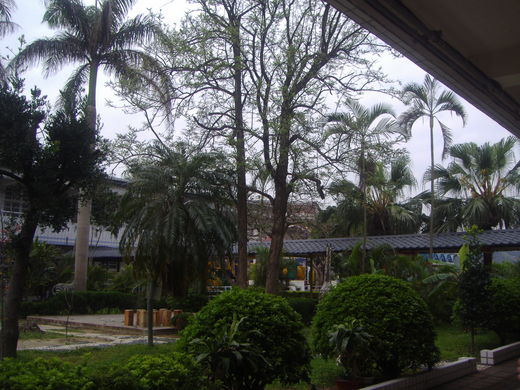 在等待小朋友集合的時間裡,禮堂外幾棵大樹吸引了目光,小朋友在樹下掃著落葉,畫面極和諧,抬頭與大樹對望,春天的生命力一覽無遺,有趣的是樹下有座土地公廟……