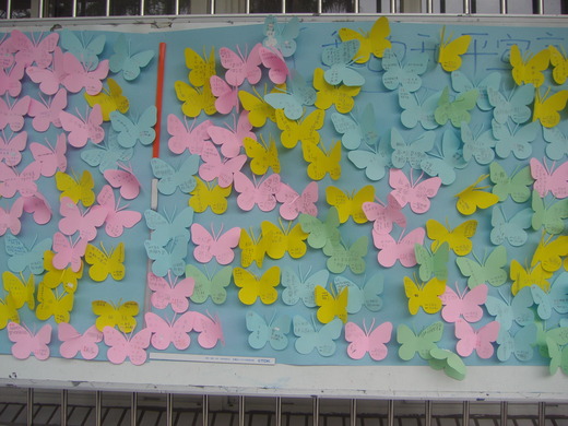 終於,全校的蝴蝶一隻隻停在事先布置好的展示板上(下次我會記得帶相機拍照),滿滿的、載著每個人的和平宣言起飛……