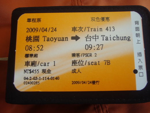 去時,我們買了橘色票(85折),桃園到台中455元現金!(費時35分鐘)