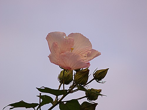後來土人四處找木芙蓉,土人大哥告訴說住家附近山上就很多,看來土人雖長在山裡,卻有眼不識寶。土人找來山裡的木芙蓉和園藝品種相比對,我們山上的木芙蓉是單瓣,不像園藝種那麼多變化,相同的是它多變的面貌,早、午、黃昏都不相同。