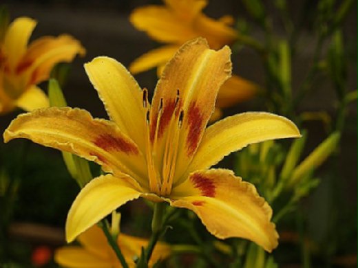 可惜金針山上的農家因金針的收成不好,目前除了部份供為觀光用外,幾乎都改種他種經濟作物或成為民宿業者的附屬品了。加上時令不對,山上一朵花也沒有。還好在金針博物館前有業者專門培養來展示的幾盆花,看來不錯,正好拍了來應景。