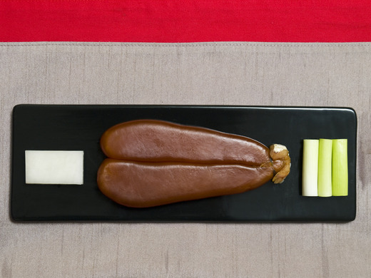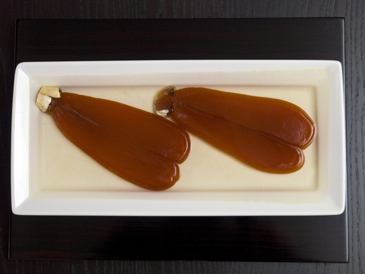 她以雙手十指去感受平板鍋裡的烏魚子,感覺整副烏魚子如情人般的火熱之後,就表示魚子熟透了,拿起來等個五分鐘冷卻除去外膜,再以明火將表皮烤香,這時候不被烏魚子香味吸引的話,表示你鼻子發炎塞住了!