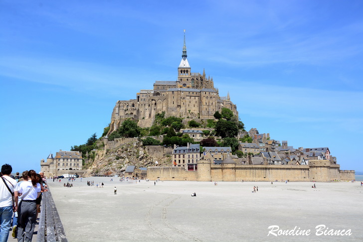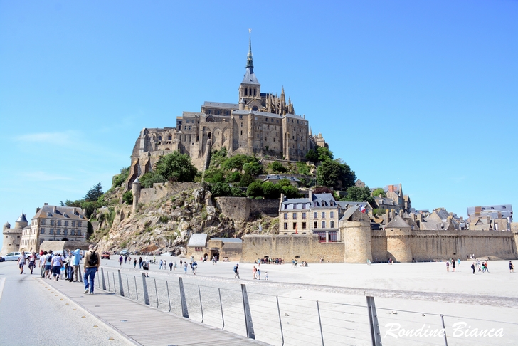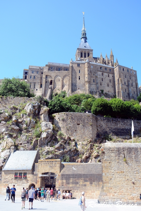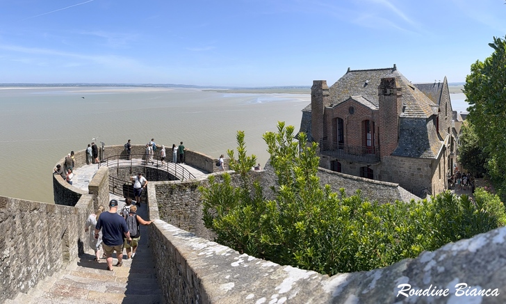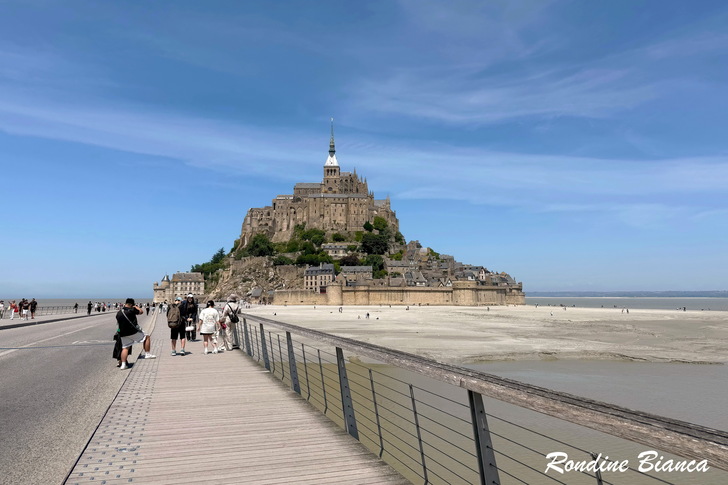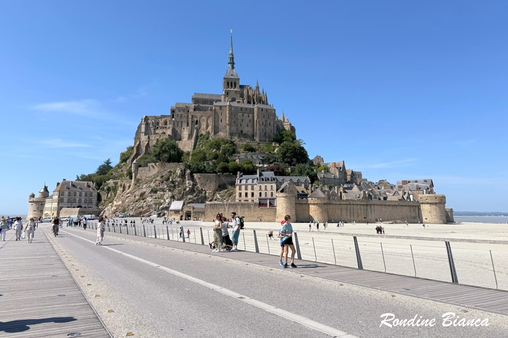 午餐後搭乘接駁巴士到達聖米歇爾山下的人行棧橋,接下來的朝聖之路就得靠自己的雙腳了!行遠必自邇,登高必自卑。仰望中跟著大批遊客朝著聖米歇爾山移動。