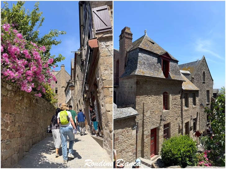 通過「王門」吊橋後,進入村莊的主要道路——大路(Grande Rue)。通往修道院的大路,兩旁林立著美麗古老的建築,並保留了中世紀的商店和招牌。如今它們已被改建為博物館、餐廳、旅館和商店,滿足遊客朝聖之餘的世俗需求。