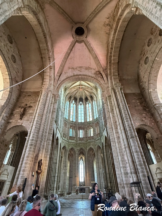 修道院教堂是一座名副其實的樓梯迷宮的中心。從這裡可以攀升至唱詩班席位的平台,也可以通過 Ranulphe 樓梯進入修道院深處,前往三聖殿或地下聖母院。