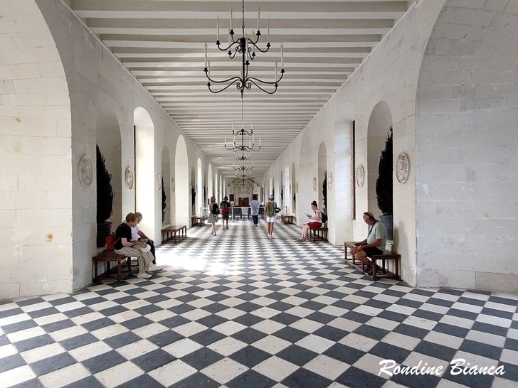 橫跨謝爾河的廊橋,是城堡中最具代表性和最常被拍攝的部分。廊橋最初是黛安娜設計的一座橋樑,後來由凱瑟琳將其增建為兩座疊置的廊道。60 公尺長的廊道兩側設有大型窗戶,擁有俯瞰謝爾河的絕佳視野,黑白相間的瓷磚地面營造出寧靜開闊的空間氛圍。歷史上,這裡曾是舉辦奢華宴會和慶典的場所,也曾用於戰爭期間的醫療收容。